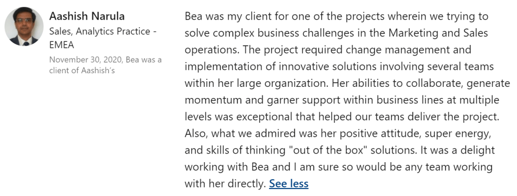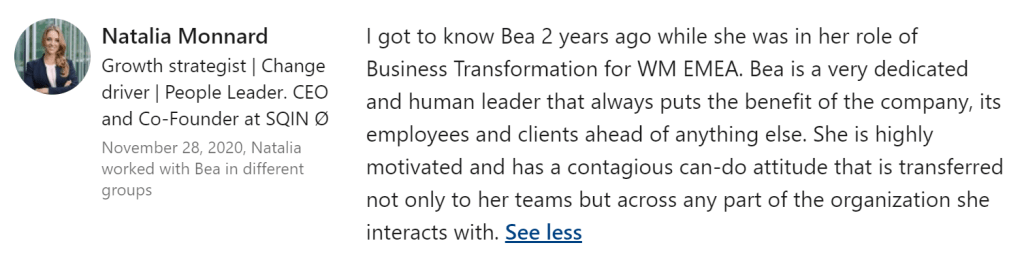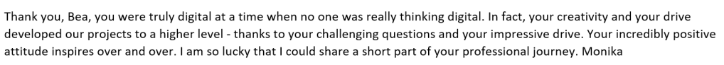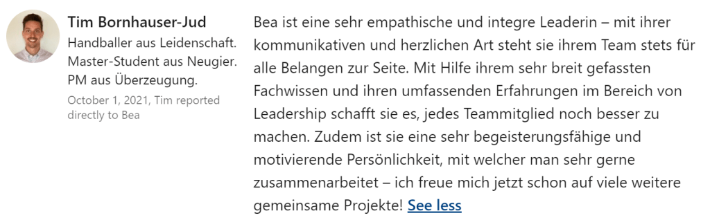Ich habe dich als offene, ehrliche, ausgeglichene und authentische Person kennengelernt. Du machst deinen Job mit viel Passion und Leidenschat, das steckt an und motiviert die Personen um dich herum, was die Zusammenarbeit mit dir einfach macht und viel Spass bereitet! Du behandelst alle Personen gleich, unabhängig von Rolle/Rang, das schätze ich ungemein an dir. Neben deiner Fach-/Themenverantwortung sehe ich dich in einer Führungsposition und könnte mir sehr gut vorstellen für dich zu arbeiten. Stefanie, 2019